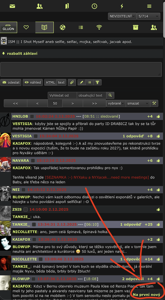 : na prvni novy se nejlip skace kdyz v seznamu diskuzi nekliknes na jmeno diskuze, ale na cervene cislo, ktere pocita nove prispevky