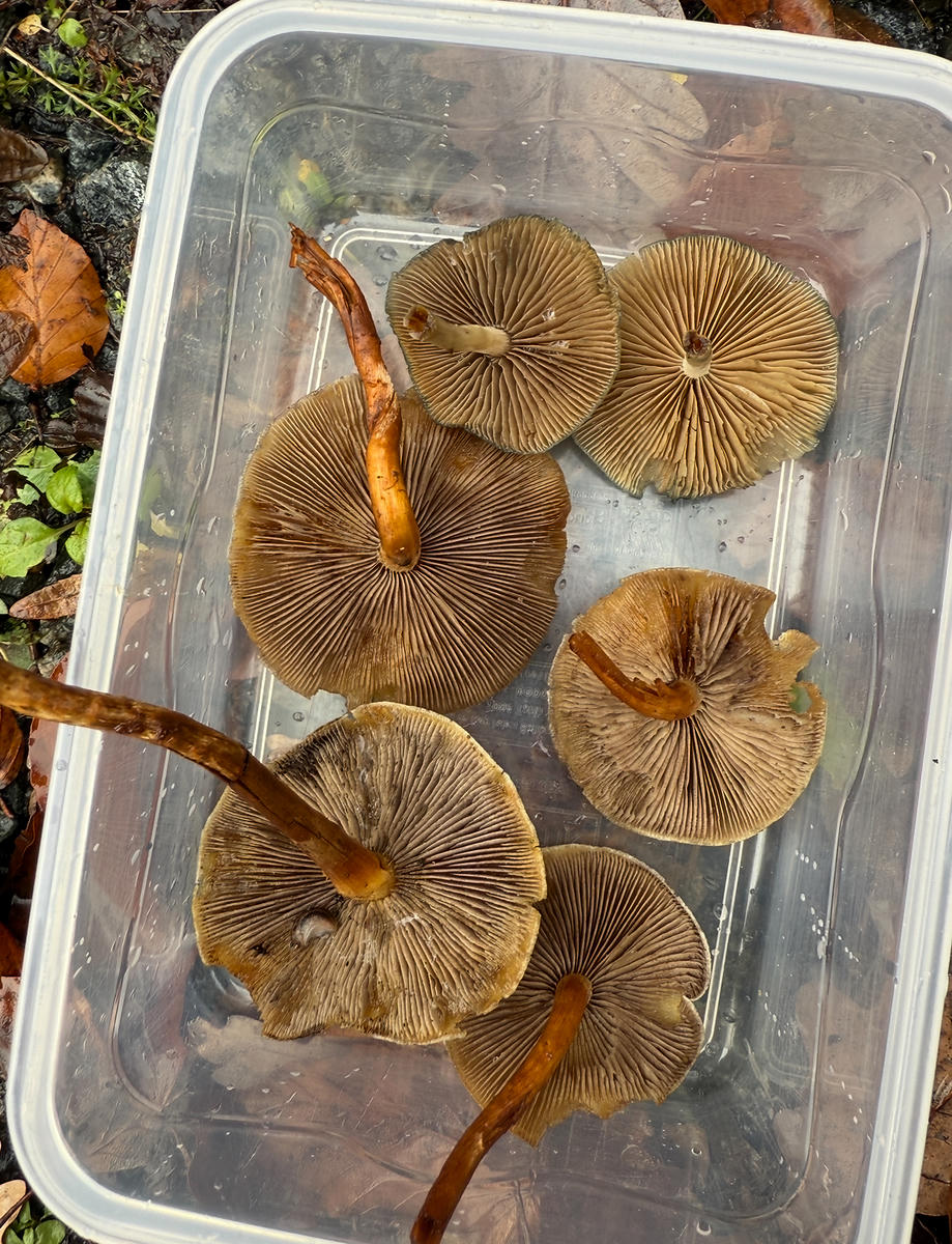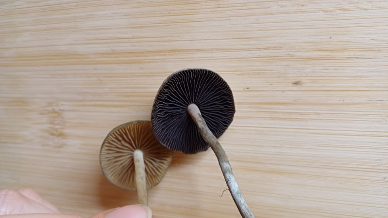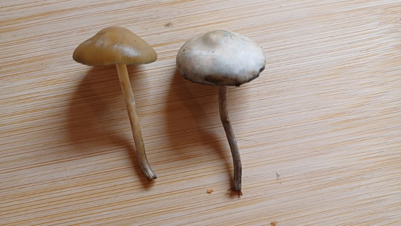 Tady mám pár hub, co mám za čepičatky a tam po usušení lupeny do oranžova jsou. Pak vlevo lysohlávka, vpravo čepičatka. Tu barvu lupenů po usušení jsem měl za potvrzovací test, pokud bych se během sběru spletl.