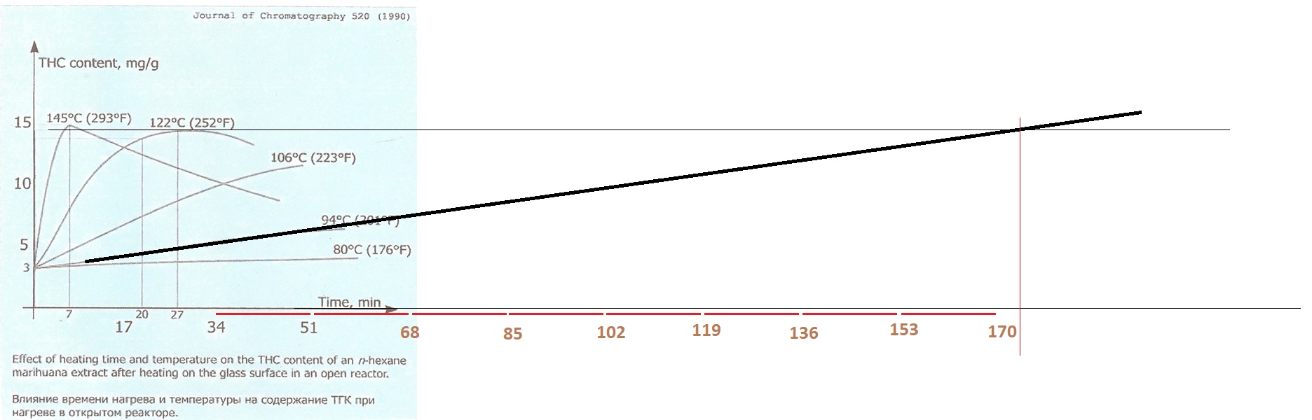 Podle extrapolace zcela na hulvata (tzn. linearne a v malovani) by bylo potreba cca 170 minut pri 94 °C. Realneji spis mnohem dyl, protoze ta linearita je po case nakopnuta spis necim konvergentnim / logaritmickym. A uplne realne budou dlouhe casy kontraproduktivni, coz vystihuje fakt zminenej v predchozi vete, totiz naruseni linearity bude zpusobene vedlejsimi reakcemi a degradacemi.