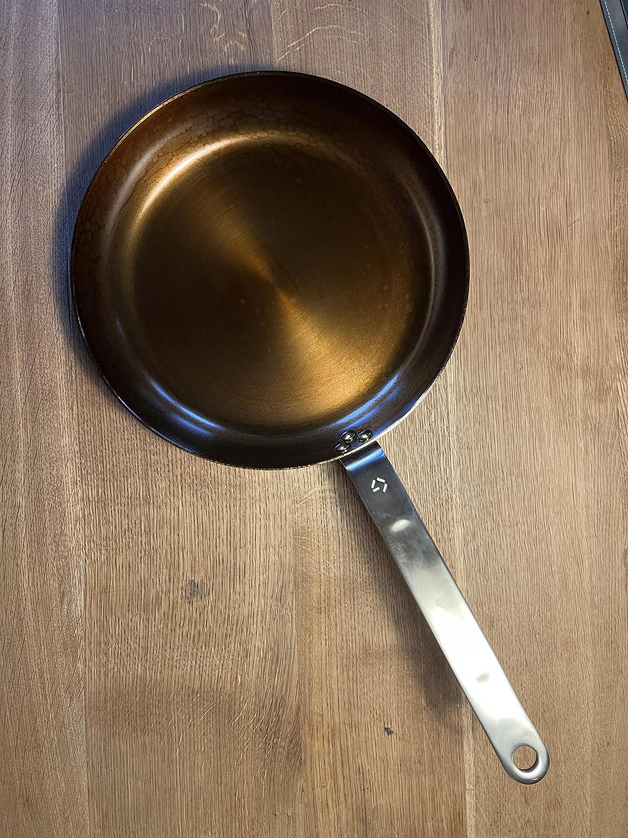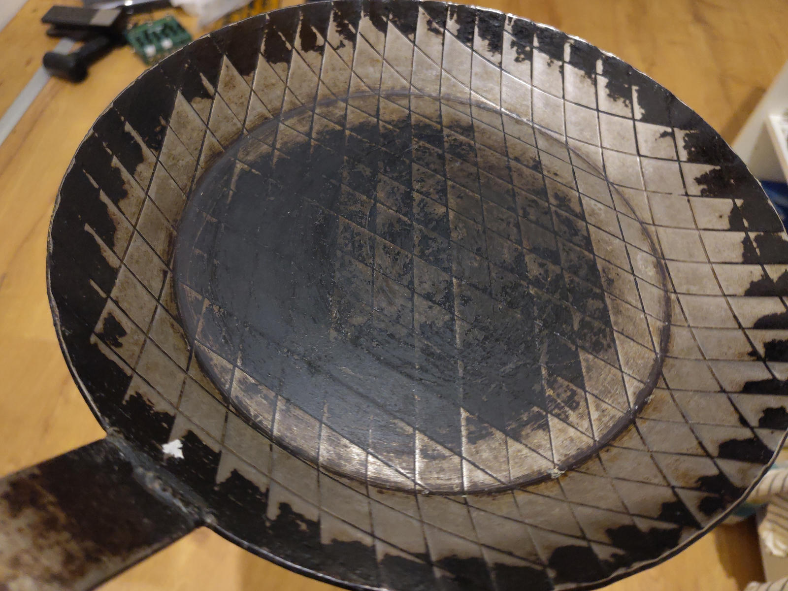 TEKKANNE: panev vycistis od evtl vrstvy proti korozi, pokryjes povrch olejem, pak pokryjes vse slupkama od brambor a ptidas spetku sole.