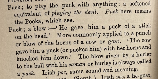 - keltský šťouch --> původ slova "puk / puck", prý ze skotské nebo irské gaelštiny. A zaujalo mě, že Wikipedie odkazuje na takovou obskurní knížečku, kterou mám shodou okolností doma (viz obr.)