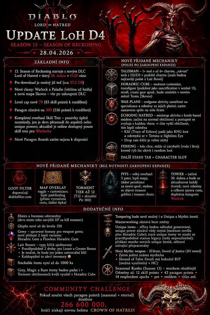 Novinka ke startu, expanze startuje April 27, 2026 on 4:00 PM PDT ale sezona startuje 4:30 PM PDT, proCR ne v 1:00 ale 1:30, pokud k tomu pripoceteme klasicky pruser Blizardich startu tzn minimalne +5h tak to znamena ze sezona startuje nekde kolem 6:30 :-) prvni vlna oprav se da cekat za dalsich 24h a stabilni hra bude tak za dalsich 24-48h :-) Takze realne tak nejak v patek 1.5. :-)
