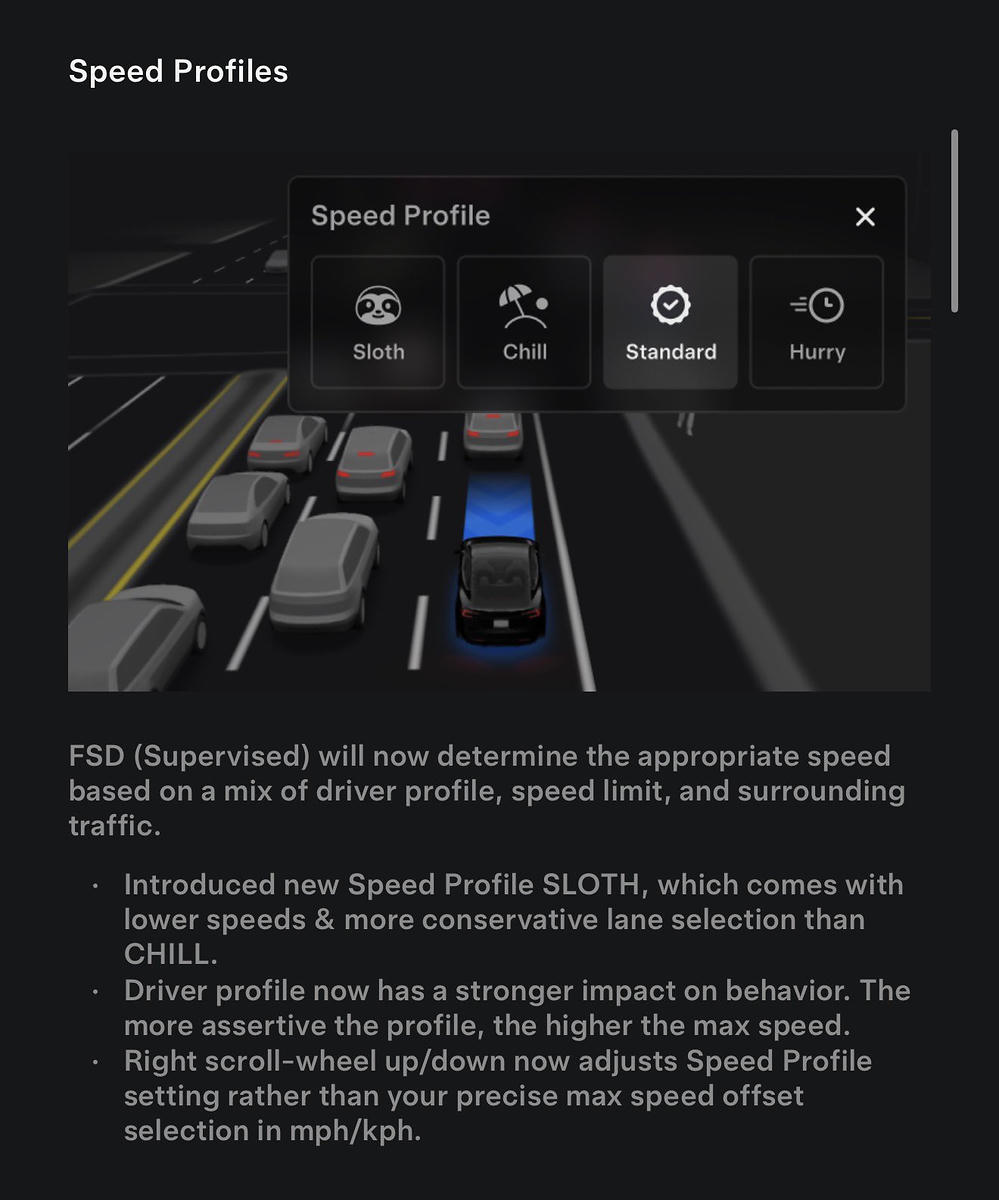 - speed profiles feel pretty different now (in a good way), although I'm pretty sure the new "sloth" mode just lowers the max speed to the detected speed limit which artificially limits it (sometimes feels like it wants to drive faster even in sloth mode but can't)