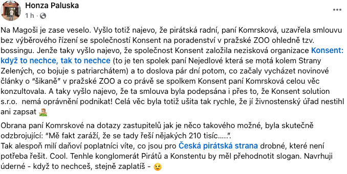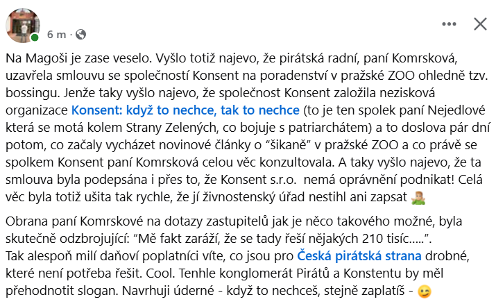 NIEKT0: Mě spíš než spekulace o cizích motivech zajímá, zda to je nebo není pravda. A protože Komrsková si s transparentností, etikou, střetem zájmů apod. v minulosti hlavu nelámala, jsem nakloněn věřit tomu, že to může být pravda.