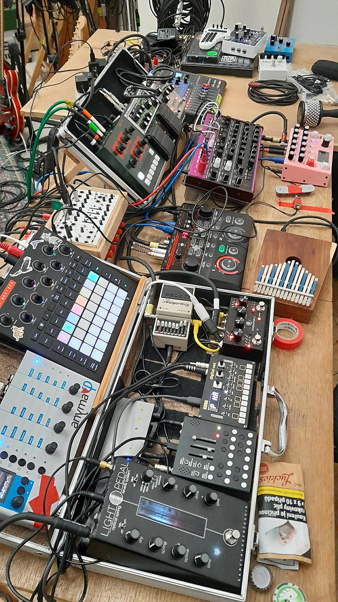 - ten posila MidiOut do ZeroSL2 na MidiIN, MidiOUT1 vraci na Digitakt2 (ovladeni), MidiOUT2 na OT(clock, ovladani), MidiTHRU na dvojku Faderfoxu, ty posilaji midi out do Digitone2(clock, ovladani)