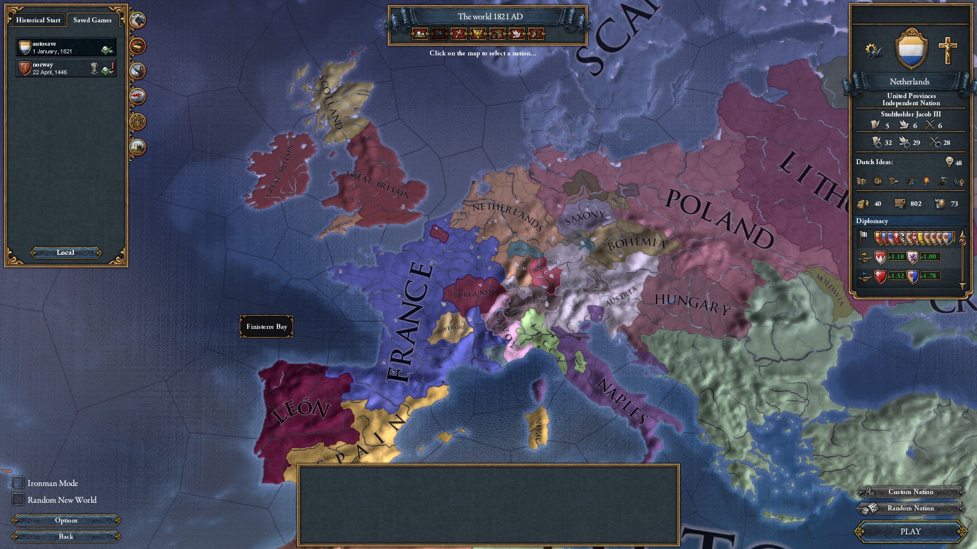 TOMAS3333: Skóre 14000 není na první hru vůbec špatné. Akorát Holandsko má dispozice stát se námořní a obchodní velmocí. Vzhledem k tomu je limit 66 lodí (a z toho jen 9 obchodních) opravdu opravdu málo. Měl bys mít něco jako 800, nebo tak nějak:-) Hádám, že jsi nehrál kolonizační ani obchodní hru.... Zajímavá alternativní historie:-) Ale pokud jsi nekolonizoval a neexpandoval do zahraničí, musel jsi někde spálit velké množství admin pointů, development tomu neodpovídá, dosažené tech levely taky ne. Jejich efektivní využití si hlídej a příště už se dostaneš přes 20 tisíc bodů.