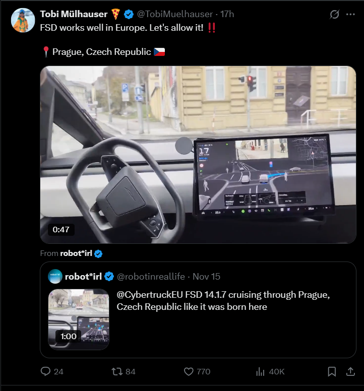 ALMAD: ted meli nedavno video jak jezdej po praze, a bylo videt jak fsd neni delana na evropsky pomery moc zatim(coz bych i chapal zatim), zastavovani na zakazu zastaveni, projizdeni cerveny doprava, couvani na kruhaci etc, reklamu si asi udelaj a muskboys budou jasat
