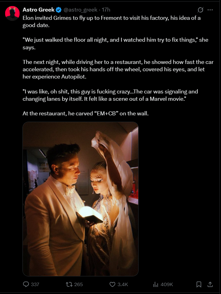GEE: Nehodi. Grimes neni moc chytra. Uz se davno rozesli. Stejne jako se rozesel s tou hereckou ktera se vysrala Johnymu Deppovi do postele. Ted ma Elon nove deti s tou holkou ze SpaceX nebo Neuralinku ci v jaky jeho firme to dela.