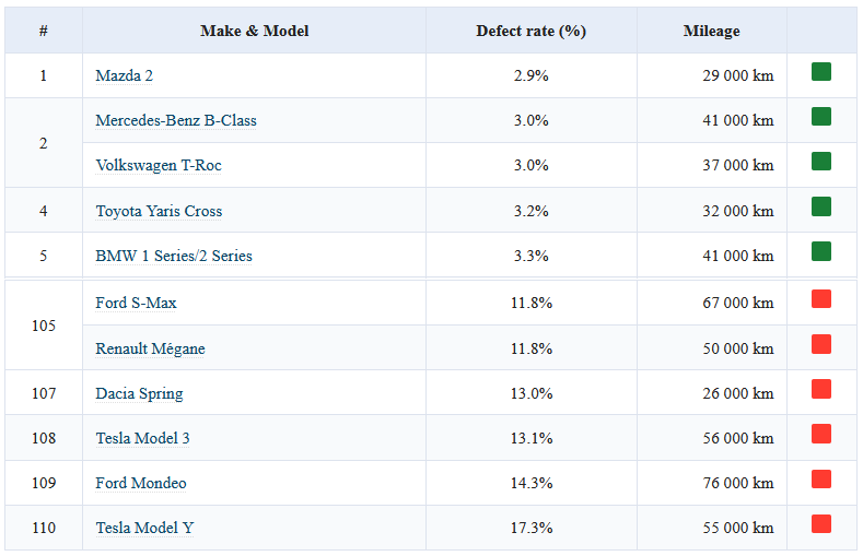 Výsledky jsou obzvláště katastrofální pro Teslu . Model Y se umístil na posledním místě ze 110 testovaných vozidel ve věku 2–3 let s mírou závad 17.3 procenta – což je nejvyšší hodnota v této kategorii za posledních deset let. Model 3 si vede jen o dvě místa lépe, s mírou závad 13.1 procenta.