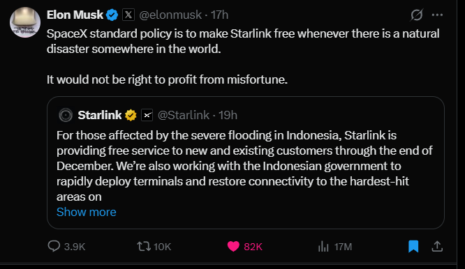 For those affected by the severe flooding in Indonesia, Starlink is providing free service to new and existing customers through the end of December 2025. We're also working with the Indonesian government to rapidly deploy terminals and restore connectivity to the hardest-hit areas on Sumatra.