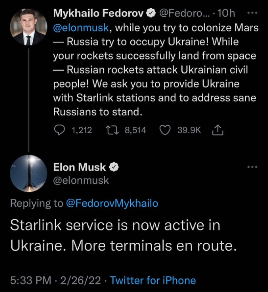 Kazdop. Elon sice Ukrajine konektivitu dal, ale behem nejvetsiho UA utoku na cernomorskou flotilu ji zarizl :]