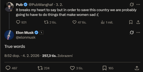 Tím, že zbundluje AI, X a SpaceX dohromady a prodá to na burze dřív, než SpaceX dostane reálnou konkurenci, vydělá spoustu peněz na věcech, které nemají žádnou reálnou hodnotu (xAI), nebo podle mě dokonce zápornou (X), zabalených dohromady s něčím, co lidé skutečně chtějí – ještě předtím, než celý tenhle průmysl znovu zkomoditizuje.