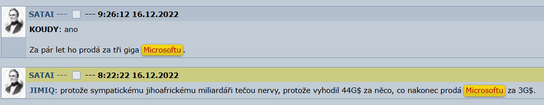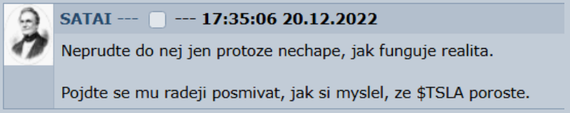 Za me Elon zatim splnil tak 80% toho co rekl ze bude. Neco bylo driv, neco bylo pozdeji, ale neprijde mi ze by kecal o levnem elektrickem aute nebo wallboxu a sobestacnosti v elektrine, nebo v internetu pres starlink a ta starship mi taky neprijde jako ze by nevynasel 4x vic starlinku do vesmiru nez dnesni raketky. Jenze ja narozdil od zdejsiho kolotocarskyho komouse do Tesly investuju nekdy od roku 2016, takze me Elonovy data nechavaj naprosto chladnejma, stejne jako data Microsoftu, Apply a jinejch fire.. protoze i diky tomu ze v tech 80% splnil Elon to co rekl, ikdyz pozdeji, jsou ty akcie za deset let snad o 2000 procent nahore. Coz sam tak nejak uznas, ze by asi nebyly kdyby se jim nic nepovedlo zejo :)