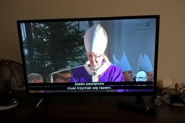 Napisy z filmu o małpach w trakcie transmisji pogrzebu prezydenta Gdańska w TVP 3...