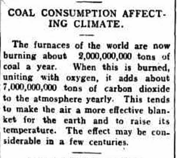 At nearly precisely 108 years old, it looks to be quite possibly the first general audience warning on human-induced climate change in Australia. The coal burning in the world’s furnaces, says the snippet in the regional paper, adds 7,000,000,000 tons of carbon dioxide to the atmosphere yearly. “This tends to make the air a more effective blanket for the earth and to raise its temperature. The effect may be considerable in a few centuries.”