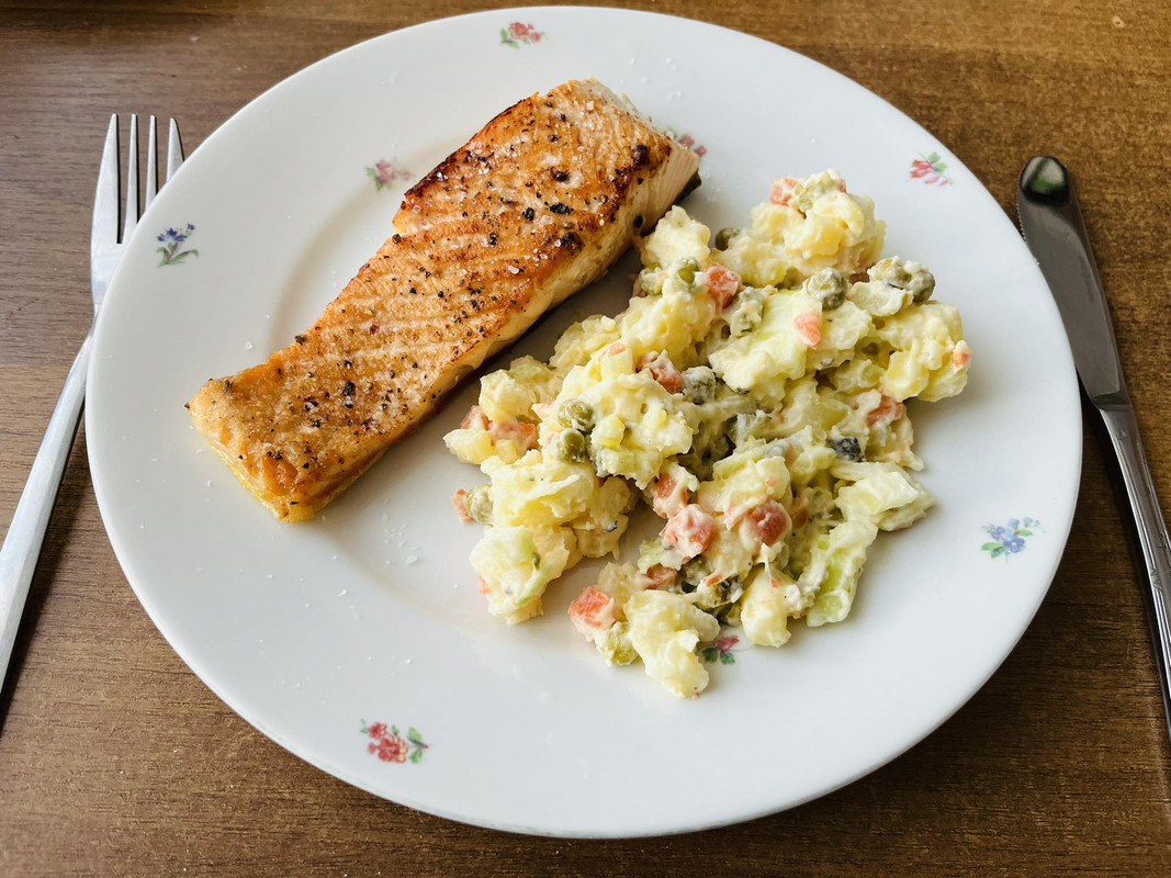 Miluju upcycling! V chladničce ve skleničce zbytek naložený mrkvičky s hráškem, v kastrůlku uvařený brambory od včerejška. Ani jedno nevynikalo svěžestí a nelákalo ke konzumaci, ale stačilo přidat okurku, majolku, zakysanku a cibuli a s troškou péče a lásky jsem z toho během chvilky vykouzlil lehkej bramborovej salát k pátečnímu lososovi.
