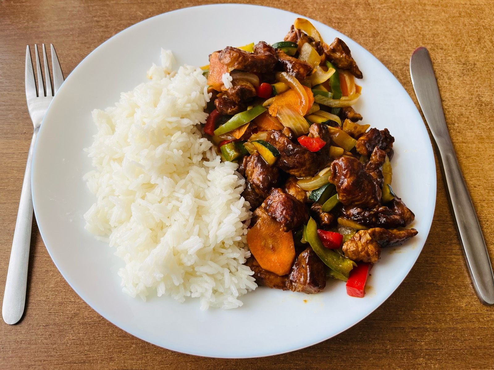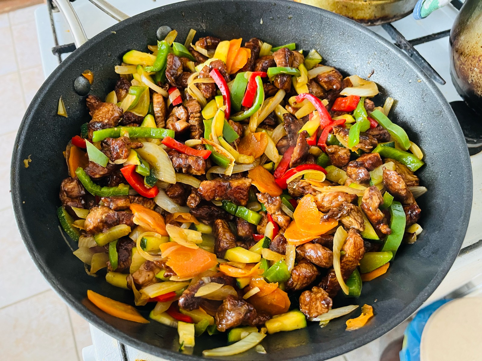 MAR_TINA: Zvlášť. Nejdřív po částech maso (většinou tak na 3-4 várky), pak maso stranou a na tý samý pánvi dělám zeleninu. Před koncem vrátím maso, promíchám, ochutnám, doladím rybí omáčkou a fakultativně rejžovým octem a fertig. Prostě postup jako na kaťák, akorát se sójovkou a bez protlaku :DDD