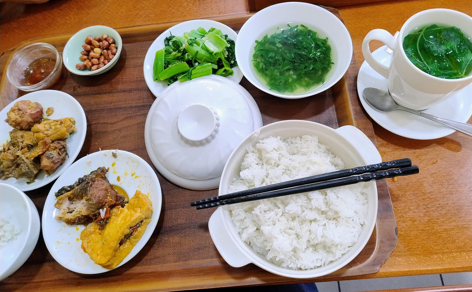 GRANTORINO: *a to je rybí omáčka děsně slaná, arašídy pražený slaný, nějakej asi jakože špenát spařený, polívka, dvě kuličky z masa, vepřové takové výpečky,, ryba a kus tofu plněný masem a miska rýže, dobrý to bylo a baví mne to míchat
