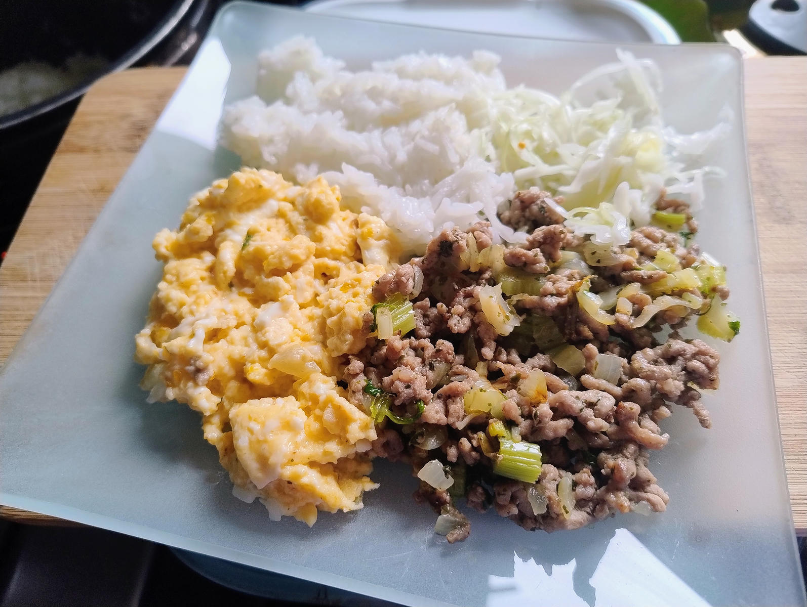 K obědu na přání starších dětí, mleté maso s řapíkatým celerem, vajíčka, jasmínová rýže a zelí s křenem...