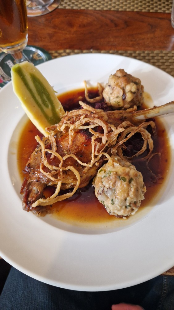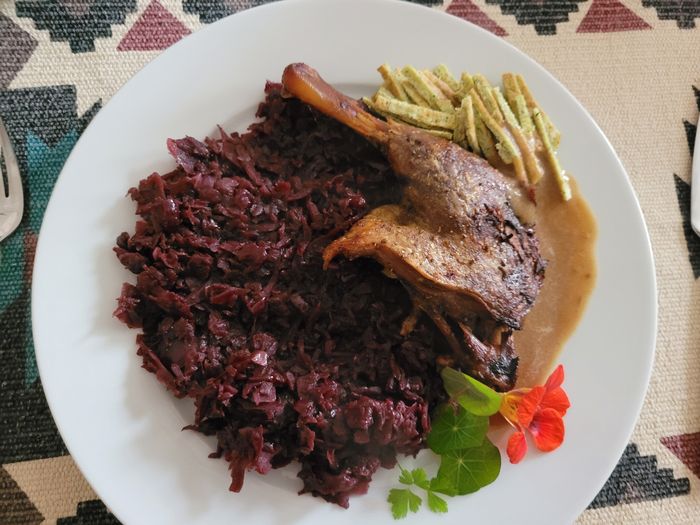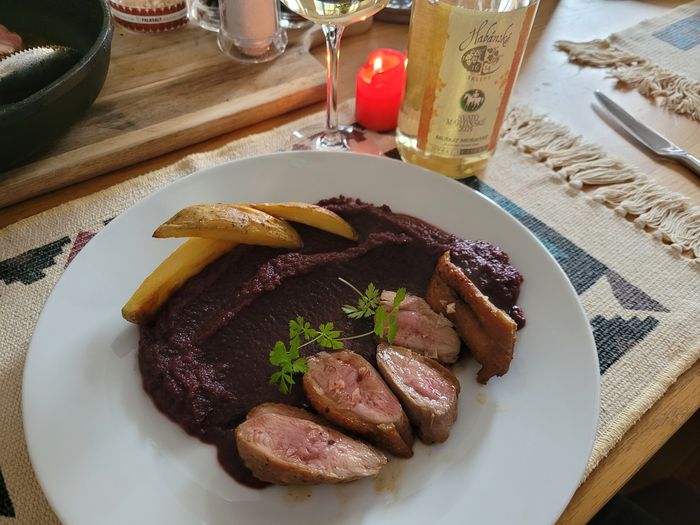 Já su z Moravy a jak stárnu, tak mě ty tradice baví čím dál víc. Kachní prso, pyré z červeného zelí s hřebíčkem, muškátnusssem a portským vínem, opečený brambor. Mladé víno nechybí.