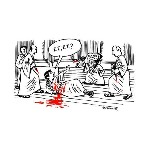 // původně tam mělo být "I ty, E.T.?", ale nechtělo se mi srát s autentickýma písmenkama, tak jsem to vyřešil takhle. Protože bez autentických písmenek by to samozřejmě stálo zahovno.