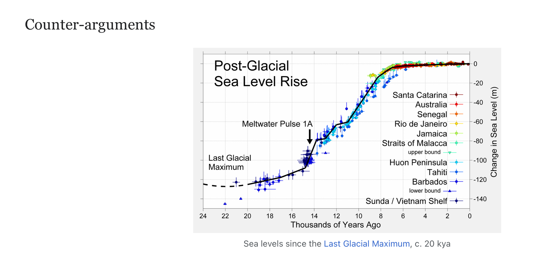 XCHAOS: jj, ta udalost zaplaveni stredozemniho more se nas skutecne netykala, to bylo asi pred peti miliony let a muselo to bejt dost dramaticky. Udajne ten proud tu gibraltarskou uzinu kazdej den (!) prohloubil o 40cm. Ale to stoupnuti hladiny o 120m pred 12000 lety se samozrejme i stredozemniho more tykalo, takze pri vedomi ze lide se nejcasteji usazuji podel pobrezi - ktere ted lezi 100m pod vodou - by to byly zajimavy potencialni mista pro vyzkum. To tani ledovcu byl pomerne rychlej (v geologickym meritku) proces a dodnes se vedou spekulace o tom co ho nastartovalo - ve hre jsou i zasahy nejakym vesmirnym telesem nebo telesy, coz by samozrejme melo i jinak velky dopady na jakoukoli kulturu ktera tehdy mohla existovat.
