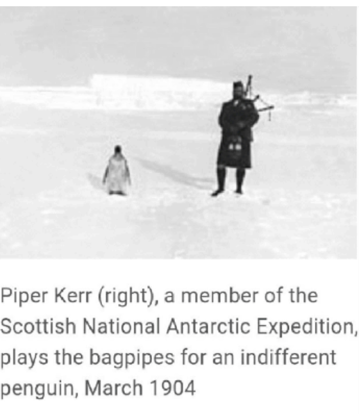 uvádí, že ten tučňák měl svázané nohy, aby nemohl utéct. Skotský kolonialismus v praxi!