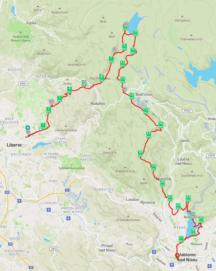 Původně bylo v plánu dojít se zastávkou u lesního koupaliště jen ke stánku Maliník a pak zpátky do Liberce přes rozhlednu Výšina (vycházelo to na 16 km asi), ale na Maliníku jsme zjistili, že autobusy do Prahy jsou plné (vždycky to podcením!) a jediné místo je až v 21.25, tak jsme si to protáhli až do Jablonce.