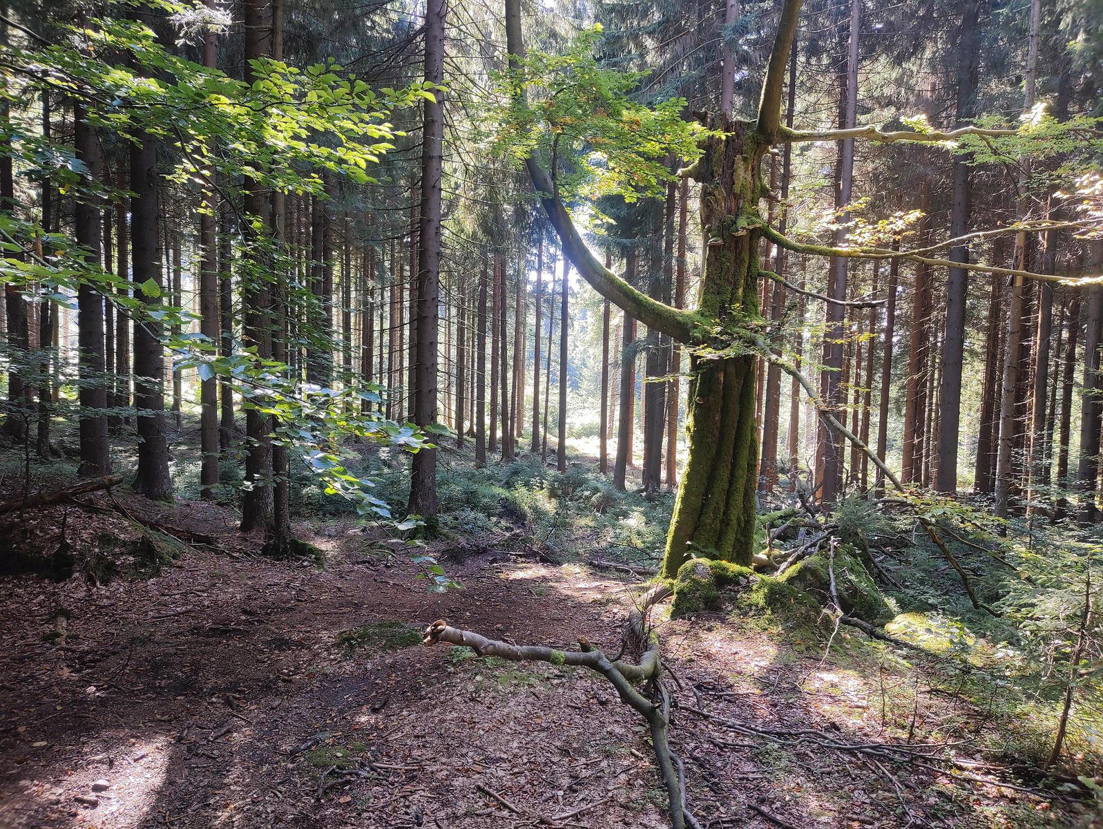 Šli jsme ve čtvrtek, vedro bylo vražedné, naštěstí naprostá většina cesty byla lesem. Stoupání dohromady asi 730 metrů, 500 metrů hned na začátku na Strážov, pak už pohoda.