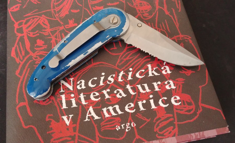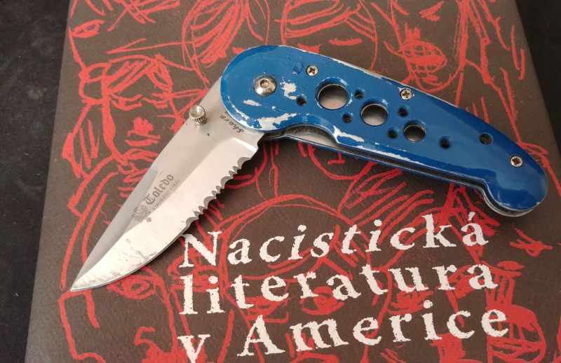 ještě teda když už otravuju - tohle je nůž, který u sebe nosím asi patnáct let. mám ho většinou zvenku na batohu přinutý klipsou na molle vazbu nebo podobně. Stál úplné minimum a drží furt. Je to teda památka na Toledo :) no a kdybych chtěl