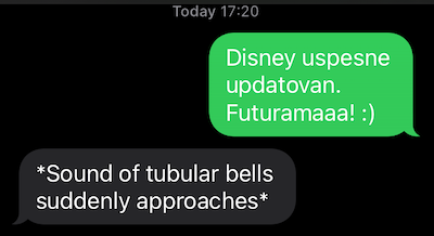 Už několik měsíců odbývám třináctiletého, že na nějaké přenastavovací hrátky s televizí teď nemám čas, že holt to musí vydržet. Dnes jsem se k tomu dokopala a poslala mu sms o úspěšném updatu, odpověď přišla obratem a v kontextu všech těch sraček, co tenhle týden řeším, mile pobavila.