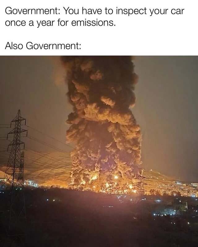 A ta pointa o zásobníku ropy je vlastně brilantní. Ten hoří a šokuje, ale je to třídenní spotřeba Teheránu. Takže ten obrovský sloup dýmu na obrázku je vlastně vizualizace toho, co město normálně vypustí za pár dní — jen rozloženě, neviditelně, z milionů výfuků a komínů. Meme ukazuje pokrytectví, ale realita je ještě absurdnější, než ten meme naznačuje.