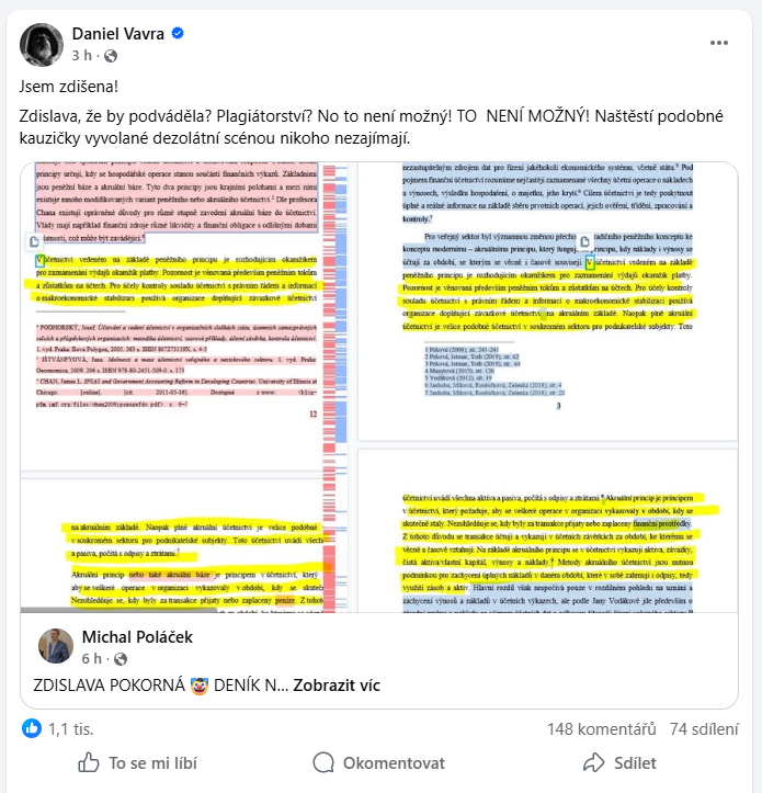 Hlavně pan Poláček vydetektivoval, že novinářka opisovala od nějaké jiné paní, což je skandál, přičemž tedy je to tak, že obě citovaly stejnou knihu, proto jsou ty věty... ehm... stejné. Někdo o tom někde něco psal a Dan Vávra hned přiběhl vysvětlit, že jednak se to nepočítá, jednak Deník N uveřejnil v posledních týdnech hromadu textů k Turkovi a jen málo k Dozimetru (fakt, jen ta čísla teda nadsadil asi třikrát) a v neposlední řadě spousta novinářů řešila Turkovu bakalářku a přitom sami píšou toto. Což je tedy nová spiklenecká teorie, že tuhle (veskrze normální) bakalářku asi nepsala Zdislava Pokorná, ale višchni novináři. Asi.