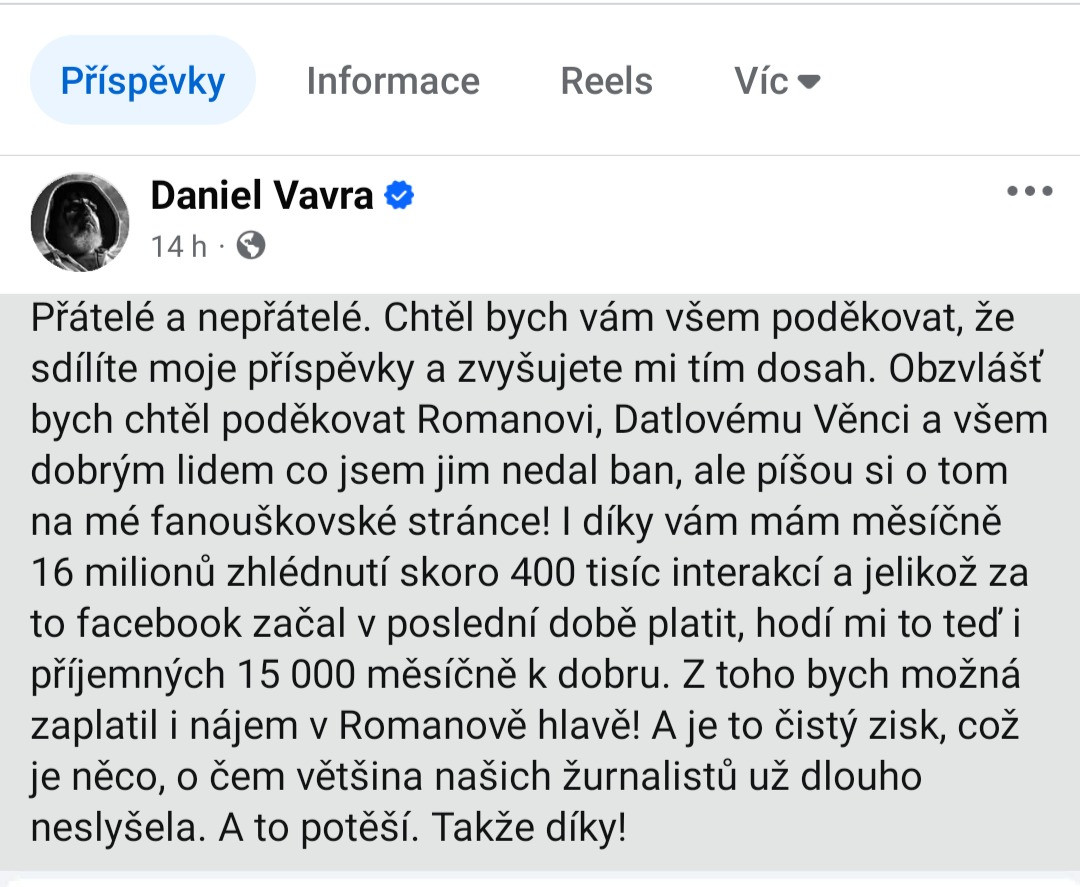 VEVERCAK: tak lidi si myslí, že i populární herci mají "důležitější" názory. nikdo nezpochybňuje, že má za sebou vávra výsledky, že se mu toho hodně podařilo a zaslouženě si vydělal hodně peněz.