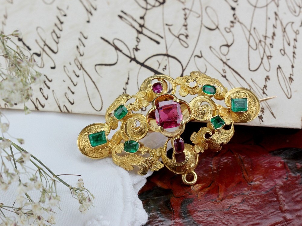 tuhle brož jsem dneska fotila v práci. je ve stylu druhého rokoka, okolo roku 1850, ze 17karátového zlata s přírodními kameny.