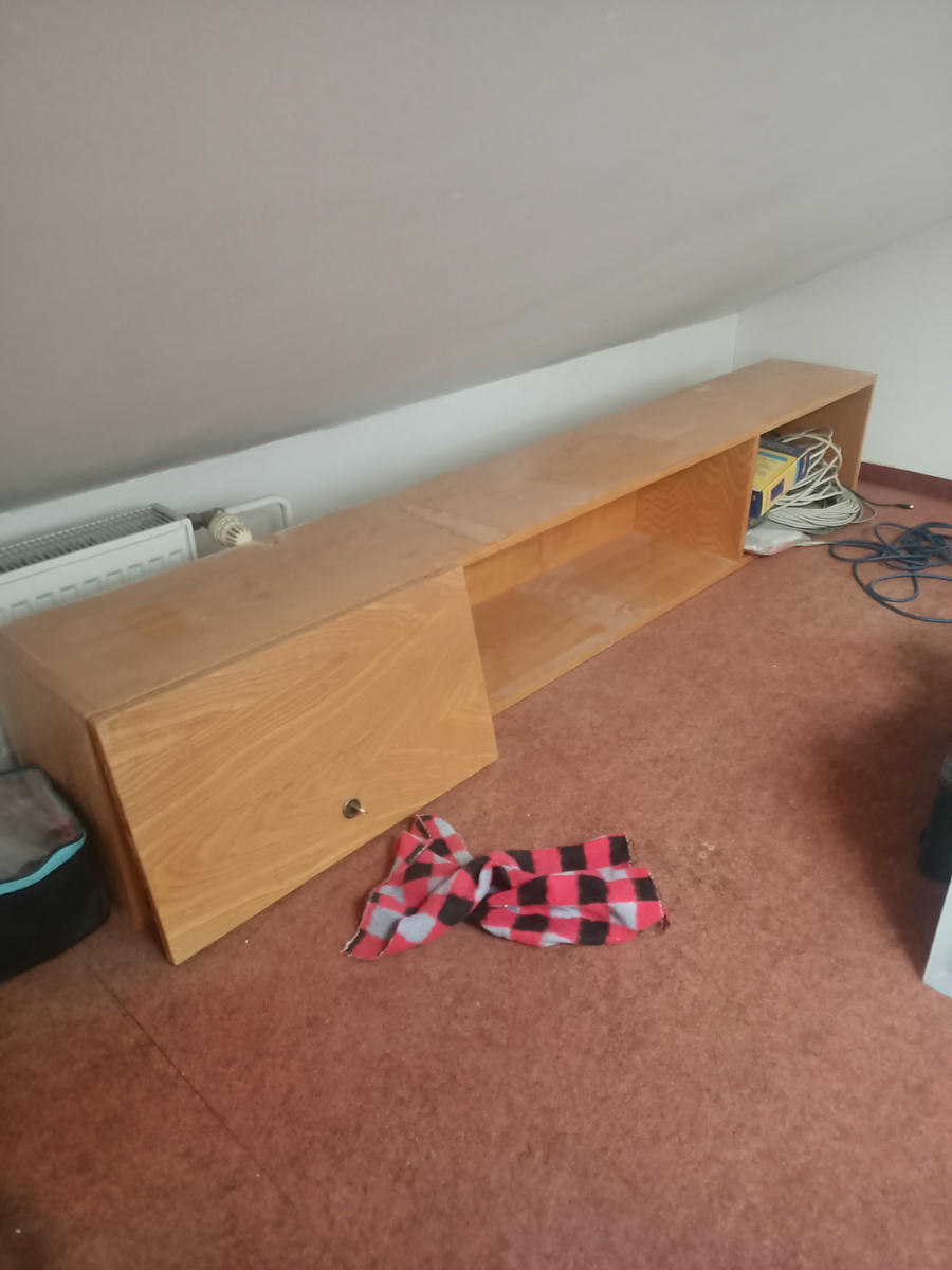 Dlouhá skříňka cca 2m, masivní dřevo, původně asi nástavec na jinou skříň, s barem (funkční). Může stát i na výšku.