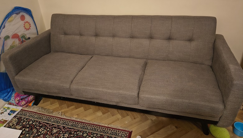 Gauč za odvoz. Šířka 62, délka 200. je na něm znát několikaleté používání, ale stále ještě může sloužit dobře. S trochou snahy jde rozložit, dvě osoby se na něm zvládnou vyspat. Jsou k němu ještě dva úzké polštářky.