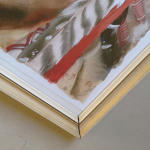 Dřevěný zlacený rám . Zaskleno . Vzadu kovový úchyt k zavěšení .