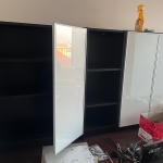 Čtyři černé knihovničky Ikea Billy + dvířka + nástavec